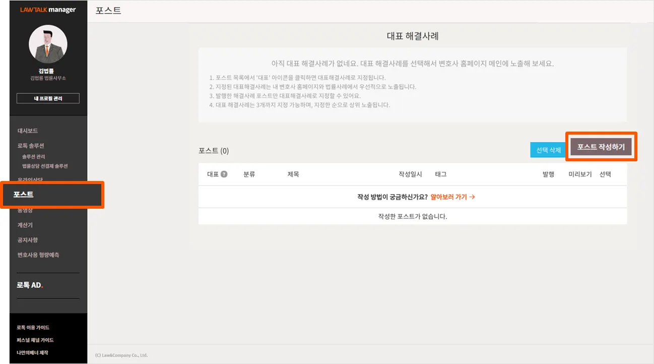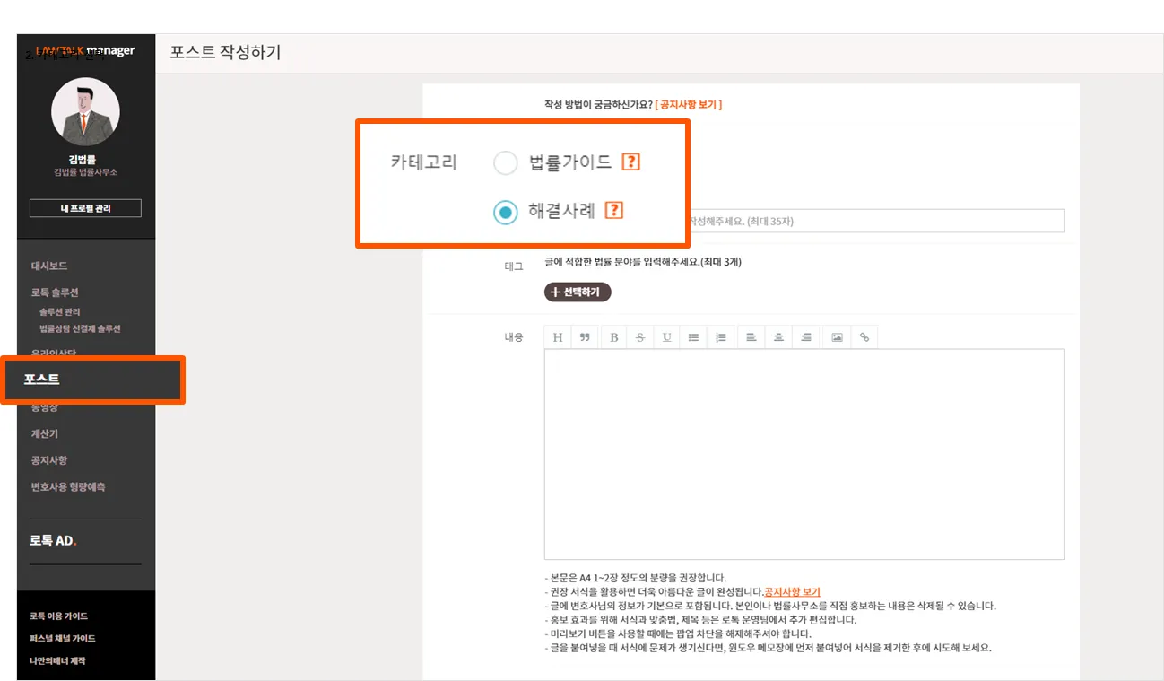 로톡 로그인 > 로톡 매니저에서 포스트 클릭 > 포스트 작성하기