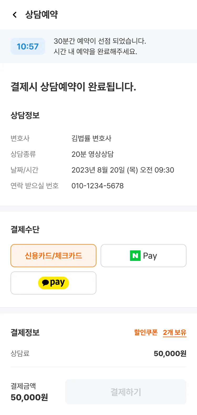 예약자의 휴대폰 번호는 050으로 전환되며 변호사에게 노출되지 않습니다.