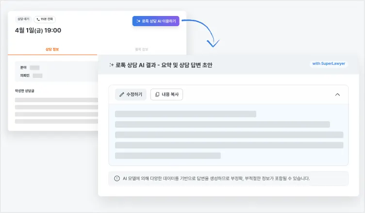 상담지원 AI 기능은 변호사 회원에게만 제공되며, 상담지원 AI에서 제공하는 답변은 변호사 회원이 최종적으로 검토·판단하여 활용해야 합니다.