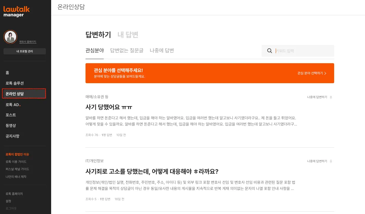 온라인 상담글 답변은 의뢰인이 작성한 상담글에 변호사님이 답변을 작성하는 것입니다. 로톡에는 하루 평균 100여 건의 온라인 상담글이 새롭게 작성됩니다. 변호사님의 전문성으로 의뢰인에게 유용한 답변을 남겨주세요. 로톡에서 작성한 상담 답변은 네이버 지식iN에 노출되며, 바로 로톡 변호사 홈페이지와 연결됩니다.