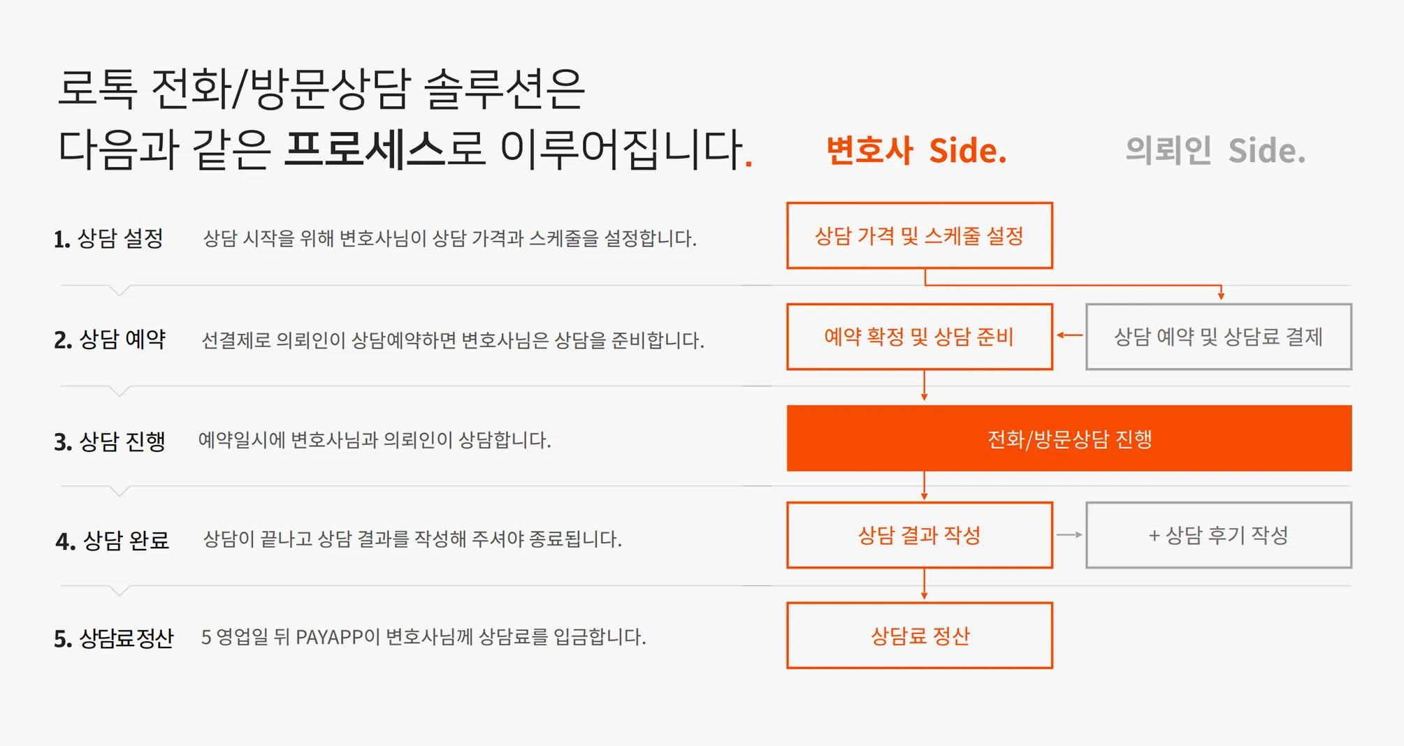 또한, 법률상담 선결제 솔루션 신청시 페이앱의 서비스 가입을 대행해드리고 있습니다. 상담료의 정산은 메일로 보내드린 구비서류 제출 후 페이앱에 등록이 완료되면 일괄 정산됩니다. 의뢰인의 상담료 결제는 신용카드로만 가능하며, 상담 완료일로부터 영업일 기준 D+5일 후에 정산될 예정입니다.