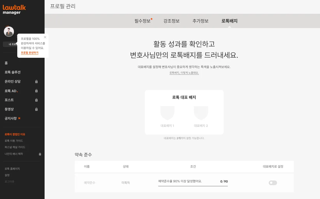 STEP 1. 로톡 매니저 - 내 프로필 관리 - 로톡 배지 클릭