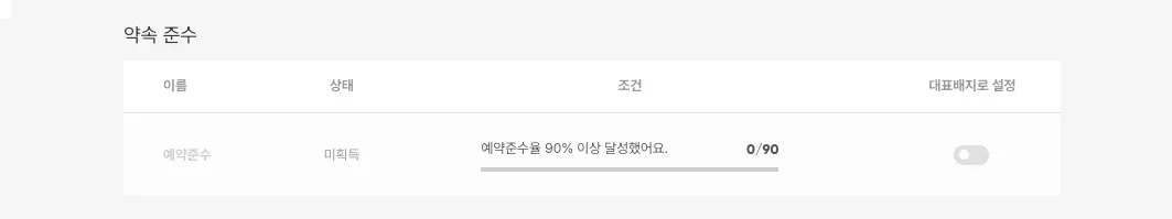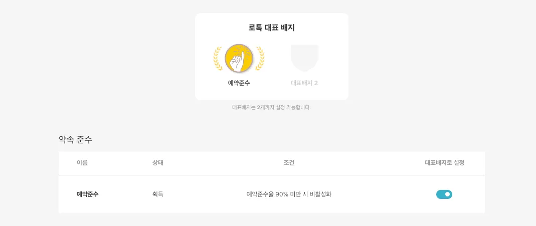 예약준수 배지는 '대표배지로 설정' 을 클릭해 즉시 대표배지로 설정할 수 있으며, 대표배지로 설정된 후 30일 이내에 변호사에 의한 상담취소건이 3건 발생 시 2개월간 비활성화 됩니다.