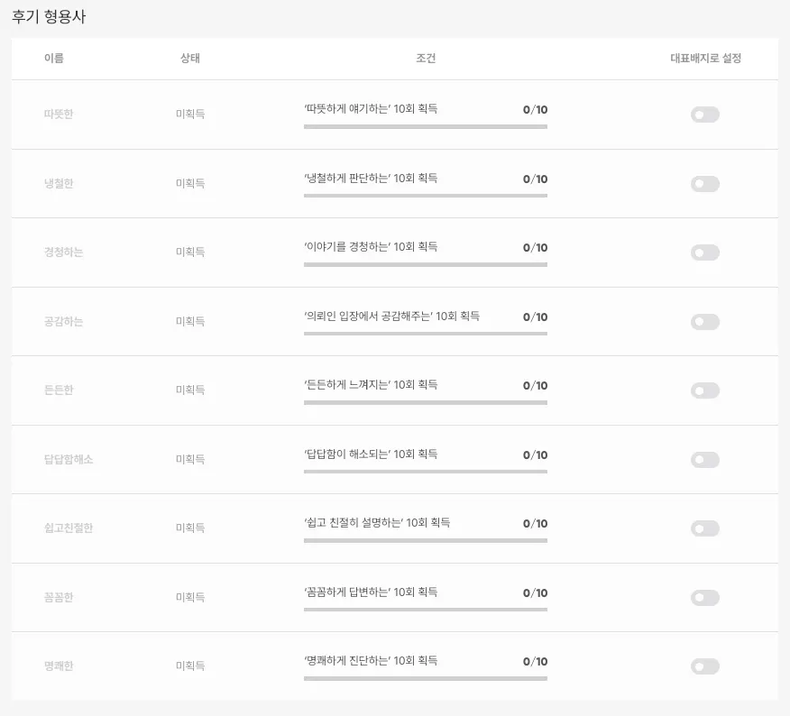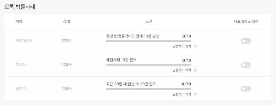 카테고리는 약속 준수 로톡 법률사례 후기 형용사 로 구성되어 있으며, 특정 조건을 만족하면 배지를 획득하고, 직접 대표배지로 설정할 수 있습니다.