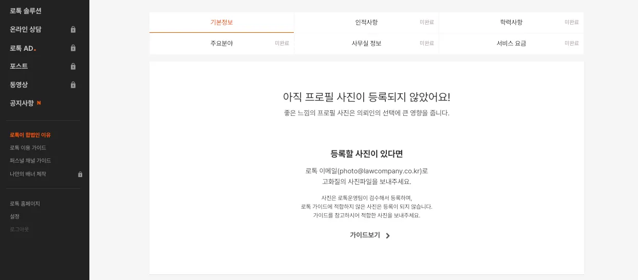 프로필을 입력하기 위해선 변호사님의 프로필 사진이 반드시 필요합니다. 등록할 사진을 로톡 이메일로 보내주시면 검수 후 등록해드립니다.