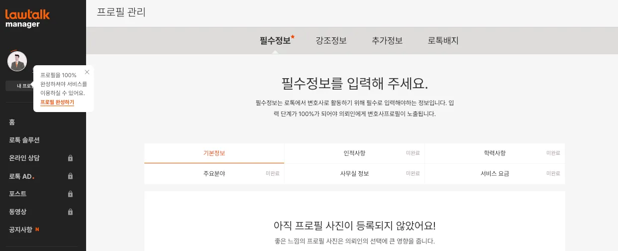필수정보는 로톡에서 변호사로 활동하기 위해 필수로 입력해야하는 정보입니다. 프로필 입력 단계가 100%가 되어야 의뢰인에게 변호사 프로필이 노출됩니다. 가이드를 보며 함께 작성해보세요.